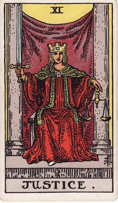 I’ve always been a giver, a mediator. I have always leaned into the role of the one who holds the space for others. Eventually, neutrality began to feel like denial. The balanced scales in Justice and the blindfold in the Two of Swords (meant to represent fairness and impartiality) suddenly looked like symbols of avoidance. I saw how often I’d worn that blindfold myself, staying quiet to keep things smooth, suppressing my needs for the sake of peace. None of it actually helped balance the scales of my life. It only kept them tipped in a direction that was no longer sustainable with how I show up in partnership.